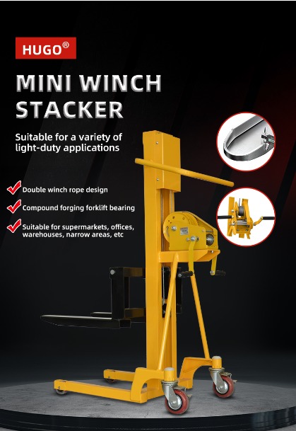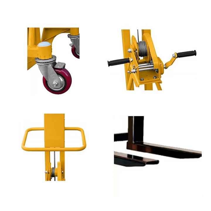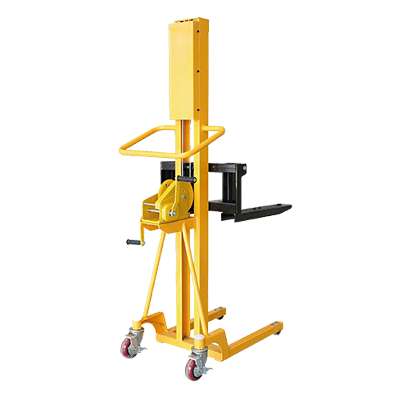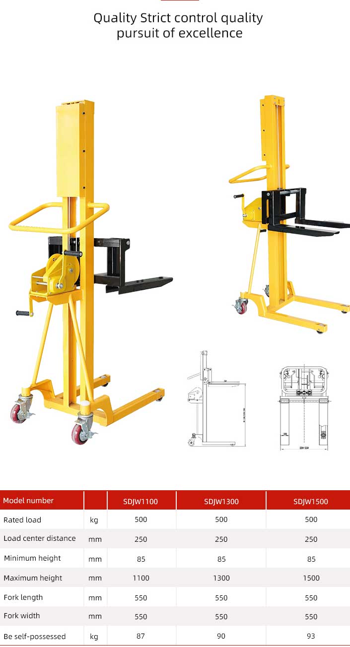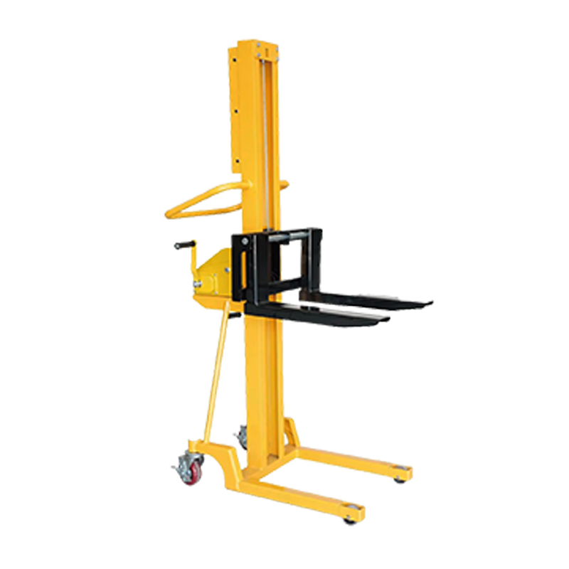 500 kg de paleta de mano Stakcer Al girar el dispositivo manual, el operador impulsa la estructura mecánica interna para elevar o bajar la horquilla de carga, logrando así la operación de apilamiento del apilador.